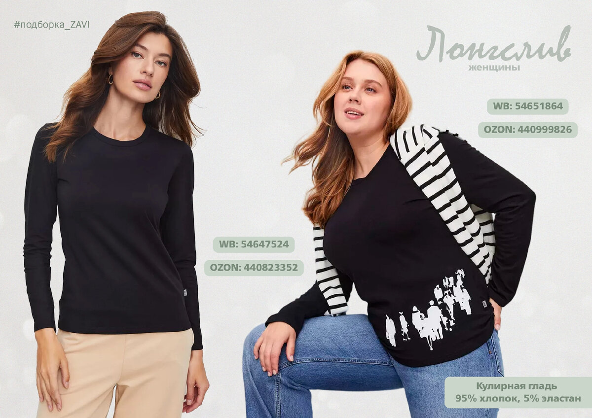 🔥 Как и обещали подборка изделий из кулирки нашего собственного производства под брендом ZAVI Женская одежда из кулирки ▪ Лонгслив женский Обязательный элемент гардероба любой женщины! Черный лонгслив универсален в своем применении: удобен, комфортен и практичен.Отлично подойдёт для дома, работы, спорта, отдыха и путешествий. Выполнен из мягкого трикотажа, который прекрасно дышит, не растягивается, не мнётся и не выцветает. За счёт плотной структуры материала он не будет просвечивать и никогда не покроется катышками. Всегда уместный чёрный цвет может сочетаться с любыми оттенками, делая стройнее свою обладательницу. 🔖 Состав: 95% хлопок, 5% эластан Данные модели лонгсливов вы может найти на маркетплейсах: 🔳 Wildberries: 54651864, 54647524 🔳 OZON: 440999826, 440823352 ▪ Футболка женская Стильная женская базовая футболка с круглым вырезом на горловине В составе содержится 5% эластана, за счёт чего спортивная футболка прекрасно тянется и идеально садится по фигуре. Материал не плотны