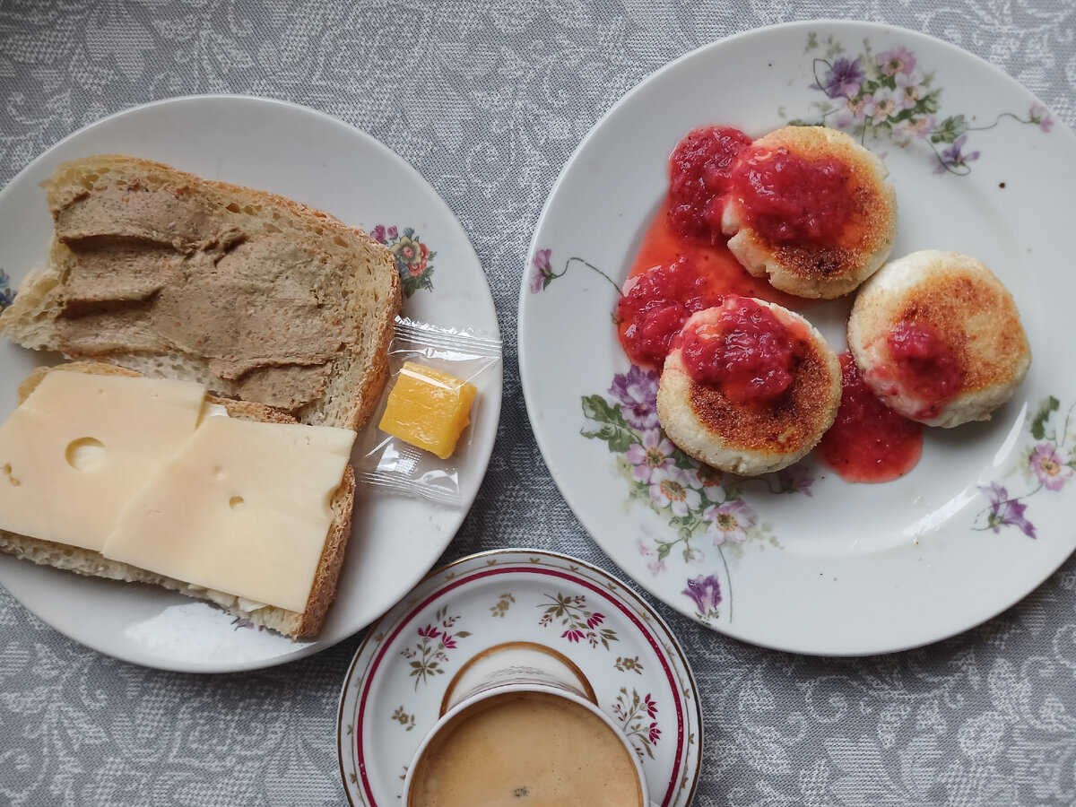О моих запасах продуктов и бюджете на питание в апреле можно почитать ЗДЕСЬ Каталог рецептов На завтрак сегодня сырники. "Тесто" сделала с вечера, утром только обжарила на оливковом масле. Чашка кофе, бутерброды с печеночным паштетом и с сыром, конфетка манго Сырники много лет уже делаю по одному рецепту, который и многим из вас понравился. К сырникам - клубничное пюре. Была баночка пюре в заморозке. Как раз банку и съели на завтрак. Сырники обваливала в манке из полбы. Обычно в кукурузной муке обваливаю, но сейчас закончилась она у меня. Обедал сегодня нормально только муж, ему давала с собой колбаски с булгуром, ну и еще всякое-разное. Я уезжала в кино и в музей. С собой брала на перекус один сырник и конфетку. Старший поздно позавтракал, младший наелся в школе. Так что по всеобщему решению на ужин был борщ и колбаски из индейки. Дополнительно решили ничего не готовить.