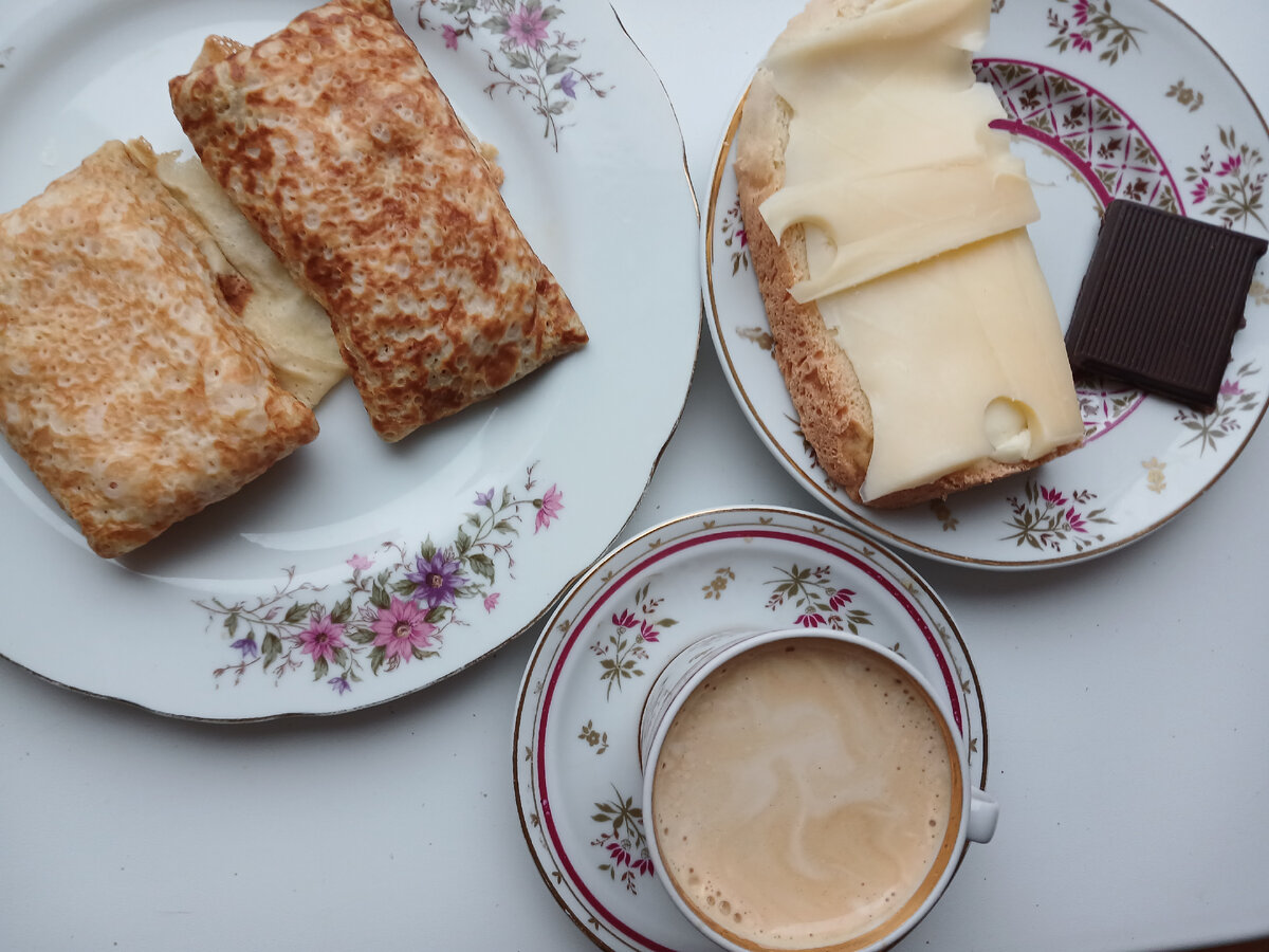 О моих запасах продуктов и бюджете на питание в апреле можно почитать ЗДЕСЬ Каталог рецептов Вчера напекла тонких блинов. Часть из них сделала с мясом, часть - с творогом и курагой. Блины по этому рецепту Блины с мясом предполагались на вчерашний ужин, но мы еще приготовили плов с курагой и нутом, салат с кальмарами. Так что оставила эти блины на сегодняшний ужин. Хотя я не люблю, когда блюда в меню повторяются, и стараюсь этого избегать при составлении меню, но семья очень даже не против есть блины и утром, и вечером 😂 Да будет так! 🙏 На завтрак тонкие блины с творогом и курагой, бутерброды с сыром, шоколад, чашечка эспрессо Блины ели со сметаной и сливовым вареньем На обед гороховый суп из зеленого горошка на индюшачьем бульоне, хумус и лаваш, бутерброды с домашней колбасой из индейки Мы с мужем устроили себе неправильный обед. Заехали в "Точку", купили по большой картошке (с кешбеком по Альфе). И еще рядом в Магните мороженое Магнат с маскарпоне и голубикой. На мороженое был 1