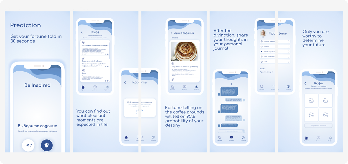 Проект представлял собой мобильное приложение, с помощью которого, можно было загрузить фотографию кофейной гущи и на основании алгоритмов нейронной сети, приложение выдавало результаты предсказания с подробным описание предсказания…