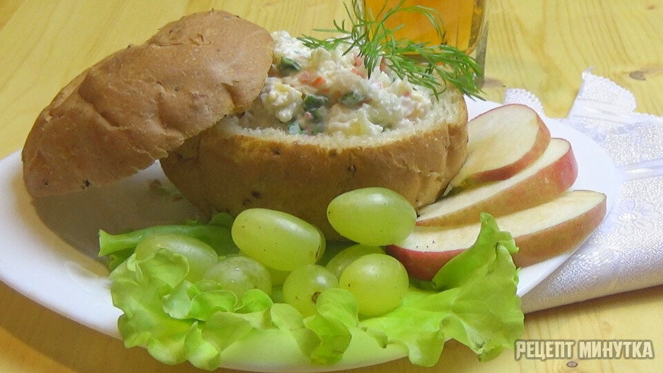 виноград и кусочки яблока На разделочной доске мелко нарезаю крабовое мясо измельчаю зеленый лук Сыр натираю на мелкой терке Вилкой раздавливаю отварную цветную капусту Выкладываю подготовленные продуты в небольшой салатник, добавляю майонез в салат С булочек срезаю верхушку. Из нижней части булочки ножом аккуратно вырезаю углубление Начиняю полые булочки салатом Выкладываю каждую булочку на тарелку поверх салатного листа, слегка прикрыв срезанной верхушкой булочки Рядом кладу кусочки яблока и виноград Восхитительный завтрак готов. Приятного аппетита!