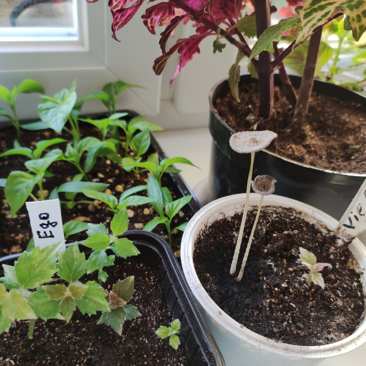 Осматривая с утра свою драгоценную рассаду, обнаружила нового жильца. Какой-то гриб вырос в посадках ахименесов. Расковырял землю и поняла, что он растёт на грануле оргавита. Такая вот "стерильность". Интересно, он ахименесам не помешает? А в остальном всё как всегда 😄
