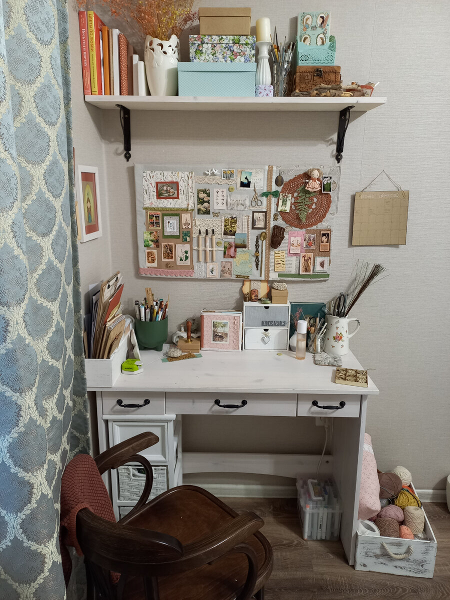 Всё началось со стола. Это наша любимая белорусская мебель из массива сосны. Со временем я поменяла ручки у шкафчиков, а под стол поставила маленький комодик, в нём храниться всякая всячина, которая на открытых местах обычно создаёт бардак. Полку над столом мы смастерили сами. Я обшкурила и выкрасила её в белый цвет, а муж занимался монтажом. Конструкция лёгкая в сборке, и она здорово заполнила пустое пространство, подарив мне новое место для хранения. Это второй житель моей мастерской. В шкафу я храню бумагу для выкроек, сами выкройки, книги по творчеству, инструменты для мастер-классов, карандаши и краски, творческие блокноты и упаковку. Этот шкаф тоже из массива сосны и иногда он издаёт щелчки, как будто напоминая о себе. Поэтому если вы захотите приобрести мебель из натурального дерева, будьте готовы что она умеет разговаривать :). 4 таких таких шкафчика папа смастерил по моей просьбе, я наклеила на дно фетровые полоски, чтобы ящики не поцарапали пол и поставила их под кровать. Муд