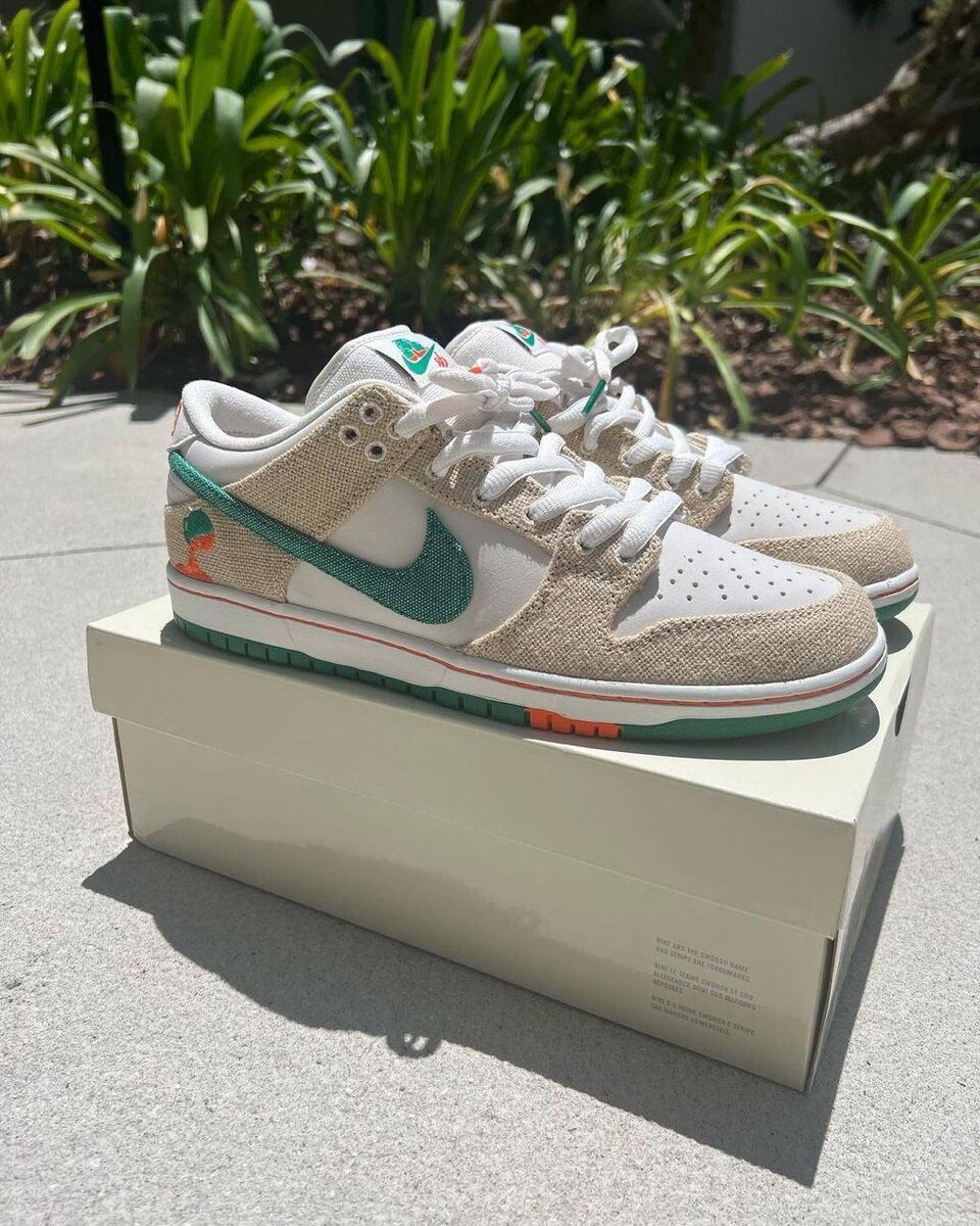 Пара Jarritos x Nike SB Dunk Low выполнена из белой кожи с накладками из конопляного волокна серо-бежевого цвета, а разбавляет дизайн зеленые галочки Swoosh и задники.