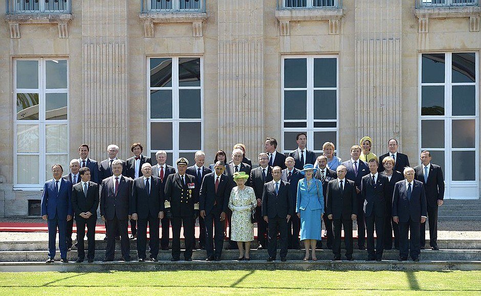 На кадрах групповое фото глав государств с участием президента РФ Владимира Путина в 2014 году на праздновании 70-летия высадки союзников в Нормандии.