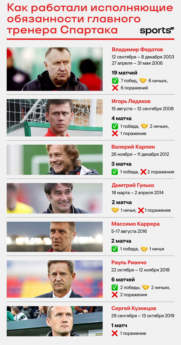 Рауль Рианчо тоже здесь. Владимир Слишкович – исполняющий обязанности главного тренера «Спартака». Он – восьмой в российской истории клуба в таком статусе. Посмотрим, у кого что получалось. ● Владимир Федотов дважды был исполняющим обязанности. Сначала в 2003-м после увольнения Андрея Чернышова. «Спартак» с Федотовым чаще проигрывал (пять раз), чем побеждал (четырежды), но именно этому тренеру пришлось разгребать бромантановые последствия – при нем препарат выводили из организма футболистов. «Спартак» кое-как дотянул до конца сезона, став восьмым в РПЛ, но прошел двух соперников в Кубке УЕФА и вышел в евровесну: там управлял уже Невио Скала. В 2006-м Федотов возглавил команду после ухода Александра Старкова – как и.о. начал с 4:1 в Петербурге над «Зенитом», вывел «Спартак» в финал Кубка России, но там проиграл 0:3 ЦСКА. Федотова утвердили главным, он проработал чуть меньше года. ● Игорь Ледяхов после увольнения Станислава Черчесова провел четыре матча – две ничьих и победа в РПЛ, но бы