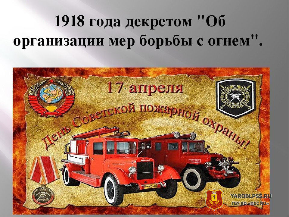 Ветераны-огнеборцы свой профессиональный праздник отмечают именно в этот день. 👨🚒17 апреля 1918 года В.И. Ленин подписал Декрет Совета Народных Комиссаров «Об организации государственных мер по борьбе с огнем», который сыграл значительную роль в деле становления и развития пожарной охраны, такой, какой мы гордимся сейчас. Им предусматривались радикальные меры по борьбе с огнем: разработка единых пожарных норм и правил, создание аппарата государственного пожарного надзора, внедрение науки в пожарное дело, строительство огнестойких сооружений, подготовка высококвалифицированных кадров. #Мособлпожспас 👨🚒🌷🎆Коллектив территориального управления №м 5 ГКУ МО «Мособлпожспас» поздравляет ветеранов- огнеборцев и всех действующих пожарных с Днем советской пожарной охраны, желаем им крепкого здоровья и благополучия