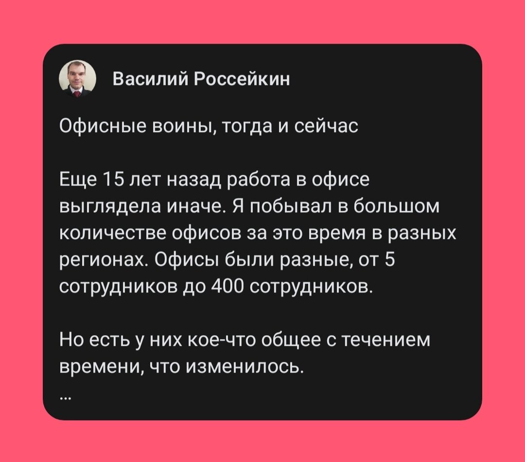 Офисные воины, тогда и сейчас Еще 15 лет назад работа в офисе выглядела иначе. Я побывал в большом количестве офисов за это время в разных регионах. Офисы были разные, от 5 сотрудников до 400 сотрудников. Но есть у них кое-что общее с течением времени, что изменилось. С моей стороны - это была установка и настройка множества компьютеров, сетей, камер и серверов в одну работающую систему по проекту заказчика, но речь не об этом. Раньше интернет был только в компьютерах, был дорогой и медленный. Можно было легко вычислить через сервер кто куда выходит в интернете и работает ли на самом деле. Люди даже покурить выходили чтобы пообщаться, обсудить какие-то сплетни (видимо важные для них) и "отдохнуть от компьютера". А сейчас, особенно те, кто помоложе, выходят "отдохнуть от работы", чтобы посидеть в своих мобильниках, посмотреть сериальчик или какое-то видео. Это уже наблюдаемо на столько, что сложно это равидеть. Могу сделать вывод, что люди не устают за компьютерами и никогда за ни