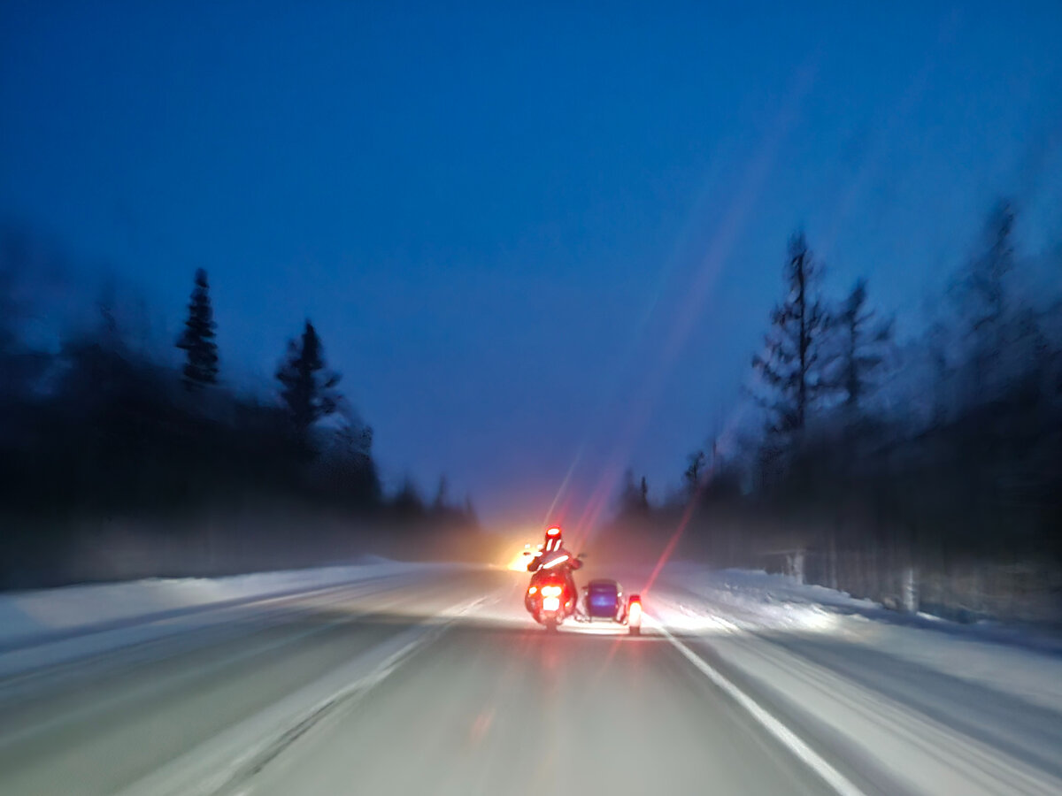 Стартую. Свежий воздух бодрит. Набираю скорость, закрываю шлем. В целом, ехать можно: чистый снег на обочинах отражает свет фар и дорогу видно, трафик небольшой, так что машины, хоть и слепят, не сильно мешают. Иду 80 км/ч. Тут меня обгоняет Хоккеист и я иду за ним. Конечно, быть ведомым в такой ситуации проще.
