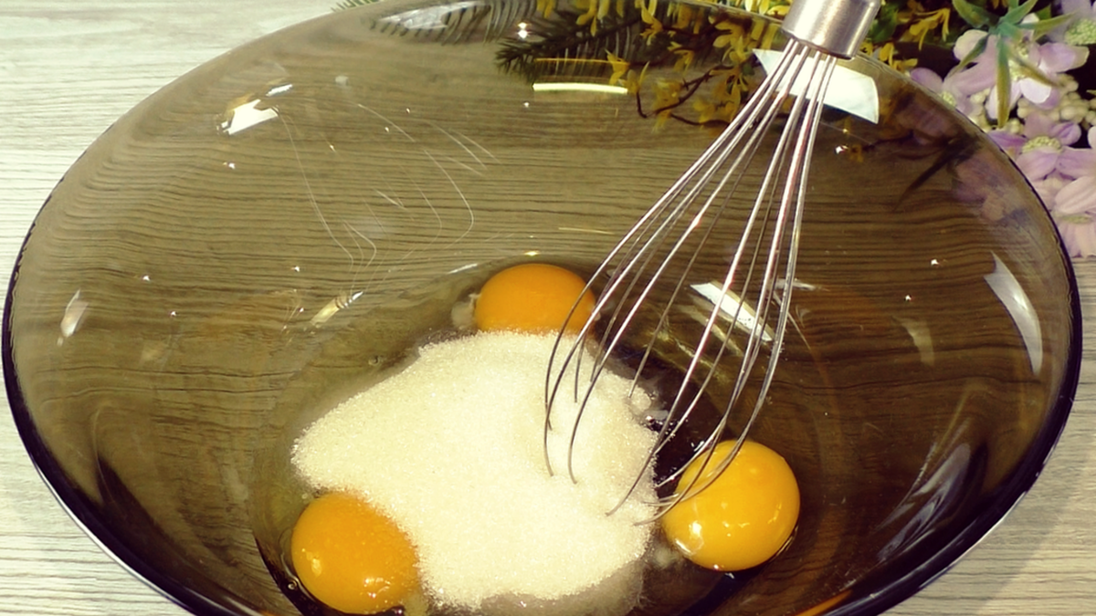 Способ приготовления: В миску отправить яйца, щепотку соли и сахар.