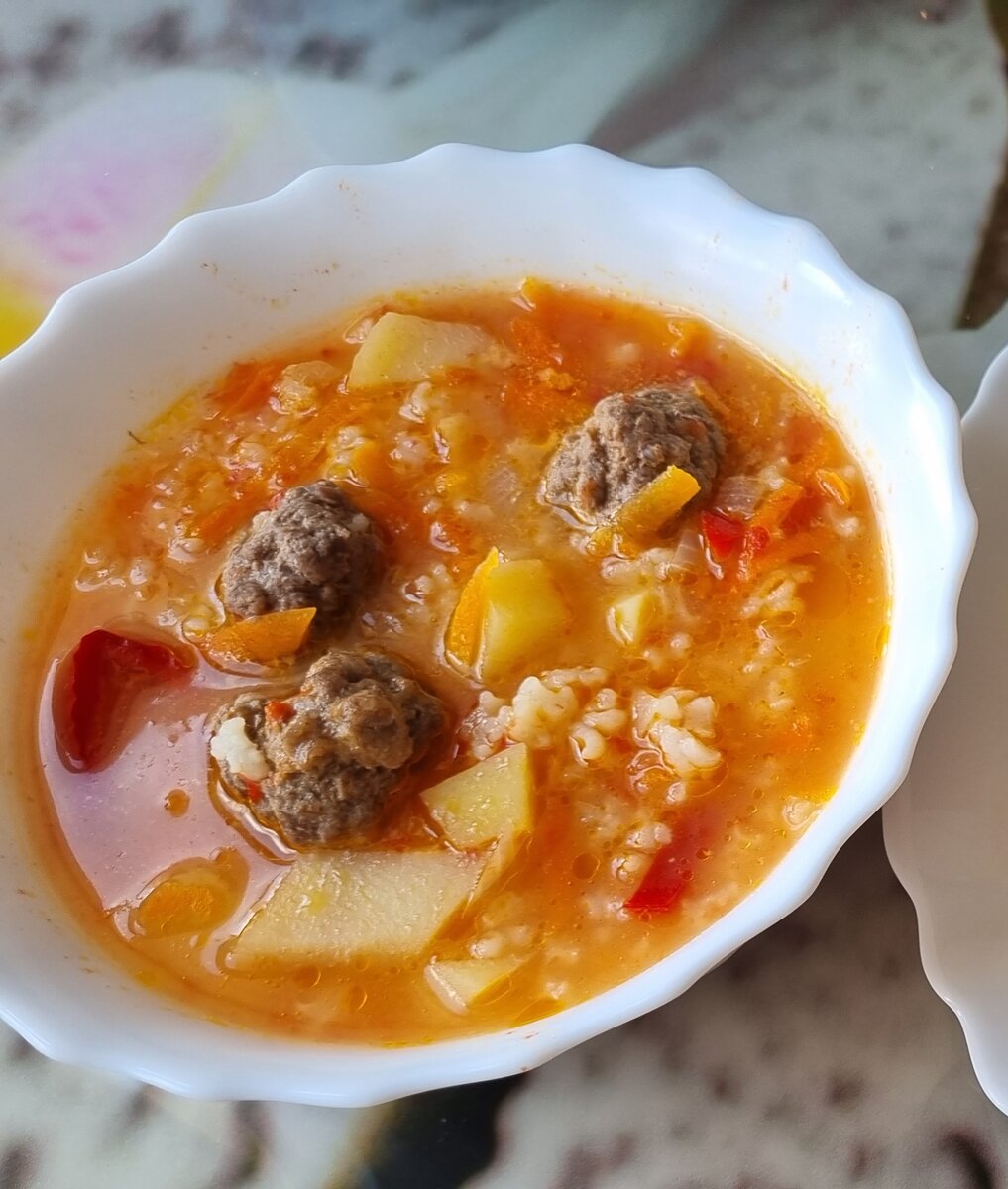 Нам нужно: 300 г фарша 1 морковь 1,5 луковицы 1 перец болгарский небольшой 2 картофелины средние 70 г риса 2 средние помидоры 1 ст.л. томатной пасты специи по вкусу 2 зубчика чеснока Мелко режем 1 луковицу, обжариваем, режем морковь кубиками (я натерла на крупной терке), режем болгарский перец, добавляем к луку, рубим мелко чеснок, добавляем к зажарке, жарим минуты 3-4, постоянно помешивая, далее режем кубиками помидор и отправляем к зажарке вместе с томатной пастой (я брала помидоры кубиками и перетертые помидоры из морозилки, впрочем как и перец болгарский), тушим минуты 3. Потом добавляем картофель и специи. Вливаем 2,5-3 литра воды (у меня был пополам вода и куриный бульон). Доводим до кипения. В это время делаем фрикадельки. 0,5 луковицы трем на терке и добавляем в фарш вместе со специями, хорошо вымешиваем и лепим фрикадельки. Как суп закипел, добавляем в него фрикадельки, варим минут 10, потом добавляем промытый рис и варим до готовности риса. Все! Подаем со сметаной и зелень