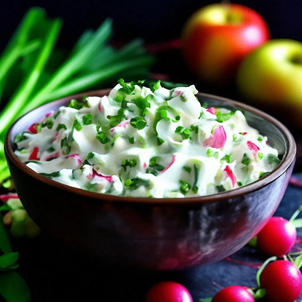 Ингредиенты:- редиска - 1 пучок,- яблоко - 1 шт.,- зеленый лук - 100 гр.,- яйца в крутую - 2 шт.,- салат листовой - 100 гр.,- сметана - 3 ст. л.Приготовление:1. Все ингредиенты порезать кубиками и соединить со сметаной.