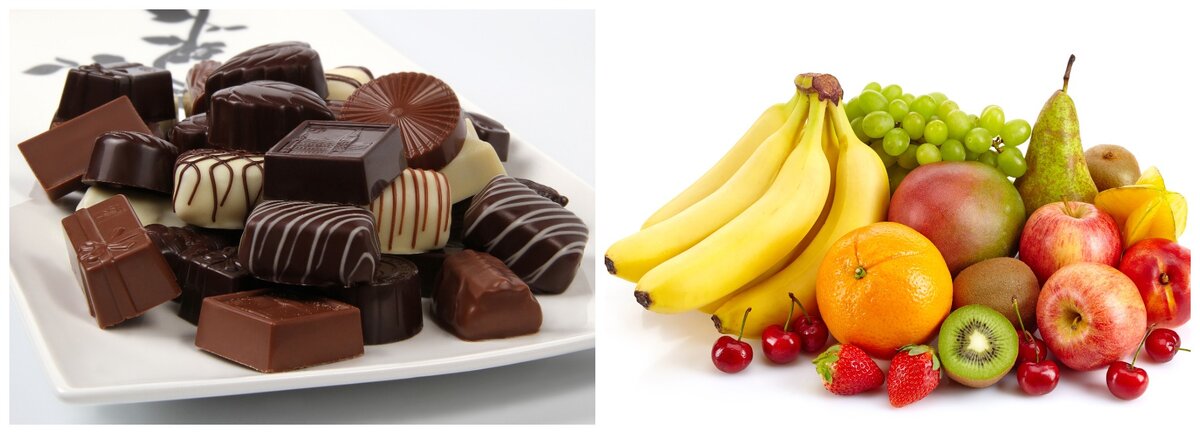 Со сладким надо быть осторожней. Сладкое — это сверх стимул для нашего организма, для нас это невероятное количество калорий. Мозг говорит: «Вау, как классно, хочу еще!». И если мы едим сладкое регулярно, мозг делает для нас другие несладкие продукты менее вкусными. *Про это у меня есть отдельные статьи >>>>>>>>>>>Первая статья из цикла Здоровое похудение<<<<<<<<<<< Фрукты лучше конфет Кто-то может съесть одну конфетку, а остальные отложить до следующего раза. А кто-то не успокоится, пока весь пакет не схрумкает. Во втором варианте лучше стараться убирать излишне сладкие вкусы. Заменять сладкое на сахарозаменители и на фрукты. Не сухофрукты или фрукты в виде конфет, а именно нормальные обычные фрукты — в них меньше концентрация сахара и плюс есть полезные пищевые волокна (клетчатка). Поэтому в плане здоровья лучше сладкие фрукты, чем конфеты, печеньки и пироженки. Вкусная сладкая еда нарушает наш контроль аппетита Если мы едим много сладкого, то нам сложнее потом есть что-то нормальное
