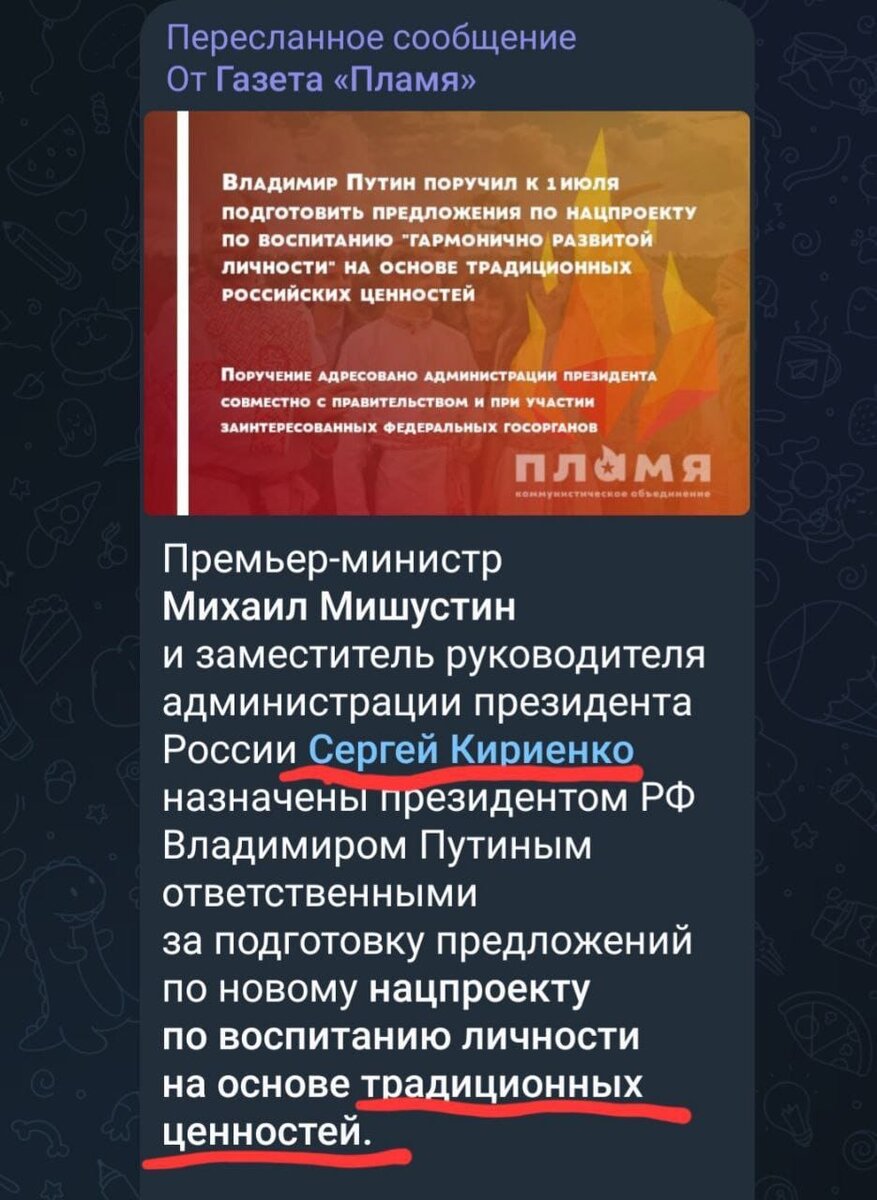 С традиционными ценностями все понятно. Они будут, и их будет много! Правда, существует такая вероятность, что вы можете их и не узнать, ведь исполнителями назначены "лучшие" люди. Да, именно Сергей Кириенко отныне будет учить вас ценностям. И не спрашивайте как...