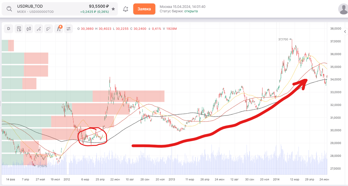 Многие после выборов прогнозировали, что власти отпустят курс рубля в свободное падение и мы увидим 100-120-200 рублей за доллар. Выборы закончились ещё месяц назад, а курс там же - надолго ли? Меня зовут Ремизов Андрей Сергеевич, информация в статье выражает мою субъективную точку зрения и не призывает к каким-либо действиям/бездействиям. Не является индивидуальной инвестиционной рекомендацией. Начнем с истории Давайте сначала посмотрим, как курс себя вел после предыдущих выборов - в 2012 году и в 2018 В 2012 году выборы прошли в начале марта (отмечено кругом), вот график до и после: К 2014 году курс ушел к 37 рублям за доллар (снижение на 20%), а в декабре 2014 на фоне присоединения Крыма курс достигал отметки 80 рублей за единицу (этого на графике нет, но это движение хорошо помним) 2018 год. Выборы прошли 18 марта (отмечено кругом), график ниже: До выборов держали курс в диапазоне 55-60 рублей, а после отпустили в свободное плавание, национальная валюта обвалилась на 27% Какой выво
