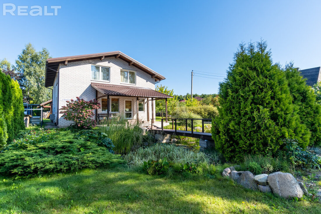 В тихом месте возле лесов Юхновского заказника, в 8 километрах от Уручья, продается двухэтажный дом с большими окнами, камином и хорошим ремонтом. Плюс большой участок с реализованными оригинальными ландшафтными задумками: например, проход от калитки к террасе дома реализован через мост над прудом. Цена для пригорода не самая высокая, учитывая, что в стоимость входят еще и баня с уличной купелью. Стоит присмотреться. Дом находится в Колодищах, в сложившейся и обжитой коттеджной застройке. В пешей доступности – лесной массив. Улица тихая, с асфальтом, без транзитного трафика. В агрогородке имеется вся инфраструктура для комфортной жизни: рядом два магазина, детский сад, школа, отделение почты и Белагропромбанка, амбулатория и многое другое. Это двухэтажный дом 2006 года постройки. Фундамент бетонный, межэтажные перекрытия – железобетонные плиты, стены из блоков, фасад кирпичный. Крыша новая – уложена польская металлочерепица в 2021 году. Площадь дома 152,2 м2, высота потолков 2,8 метра.
