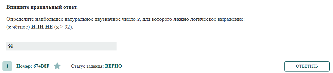 Определите наибольшее натуральное двузначное число x, для которого ложно логическое выражение: (x чётное) ИЛИ НЕ (x > 92). РЕШЕНИЕ Имеем логическое выражение: (x чётное) ИЛИ НЕ (x > 92) Уберём отрицание, заменив условие в скобках на противоположное: (x чётное) ИЛИ (x <= 92) Для того что бы выражение было ложно, должны быть ложны оба условия в скобках, так как они соединены союзом ИЛИ. Значит мы ищем такое число, которое является нечетным и при этом 92<х<100. Наибольшее нечётное число в интервале х=99 ОТВЕТ 99