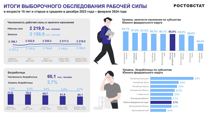 Ростовская область,15 апреля 2024. DON24.RU. В Ростовской области численность безработных граждан с декабря 2023 года по февраль 2024 года составила 60,1 тыс. человек в возрасте 15 лет и старше. По сравнению с данными годичной давности общая численность безработных снизилась на 18,8%. Об этом сообщает Ростовстат. «Занятость населения в Ростовской области является одной из высоких среди субъектов ЮФО. В декабре 2023 года – феврале 2024 года уровень занятости населения в регионе составил 61,5%», – сообщает источник. В регионе уровень общей безработицы составил 2,7%. С сентября по ноябрь 2023 года уровень общей безработицы составлял 2,9%. Фото: Ростовстат