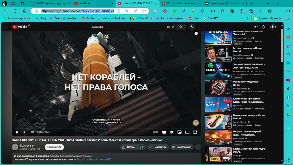 Наивность видео тем не менее не останавливается только на том, что мол РФ и Китаю следует осознать необходимость копирования сверх тяжёлой ракеты, проекты которой, и в той, и в другой стране существовали задолго до рождения Илона Маска, и кто у кого копировал, это, вообще говоря, большой вопрос. Но в самой по себе провокации космической гонки, словно и гонки вооружений. Нет, понятно, что есть то хочется, и потому чем больше высокотехнологичных новостей, тем лучше, что же что и большей частью видео реклама создаётся словно под копирку. Сбить все что построил И. Маск, ни представляет большого труда. Более того, пусть скорее и в смысле Совы Минервы что вылетает постфактум, но в США вполне трезво могут задуматься о перспективе гражданской войны. И почему такой канал так залип на вопрос, есть ли ему что-либо предъявить, выставив достижении И Маска, что, вообще говоря, не закончены. Суперракета, ещё не сработала так как надо, и быть может ещё рано говорить гоп, пока не прыгнули. Может быть, но поиграть во власть каналу видимо явно хочется. Делать ценные указания, раздавать задачи и ставить проблемы. Вида, пусть отчасти и зеркального, пусть я и кимвал звучащий, но я звоню сам по себе, а в тебя крамола– барабан, всякий кто захочет бьёт. Нет кораблей- нет права голоса», может быть. И что корабли есть у крамолы? И если нет, то от чего она так разливается едкой критикой белладонны, красавки обыкновенной?