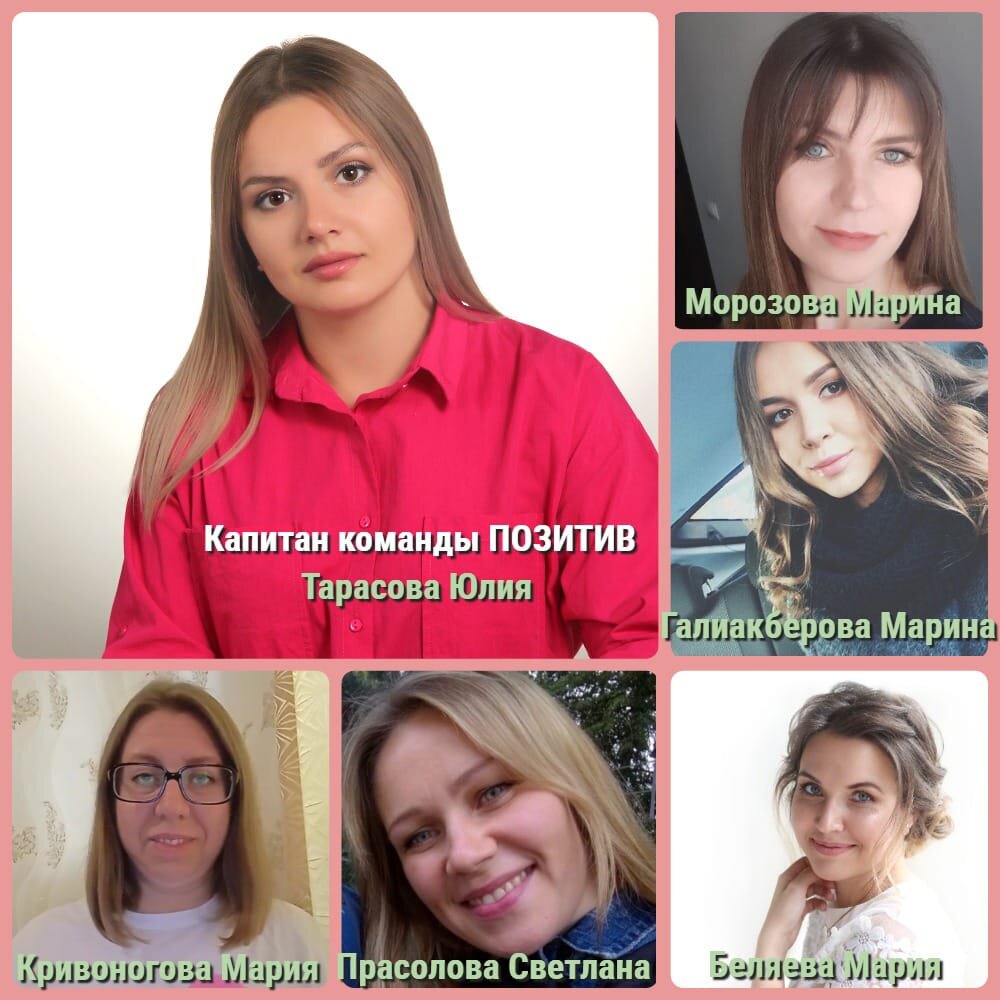 Итак, марафон стартовал! Первые задания получены и мы приступили к их выполнению, результатами поделимся чуть позже. А пока представляем вашему вниманию обновленный состав команды ПОЗИТИВ! Две Марины, две Маши, Юля и Света! 1. Тарасова Юлия 2. Кривоногова Мария 3. Морозова Марина 4. Беляева Мария 5. Галиакберова Марина 6. Прасолова Светлана Познакомимся с нашим новым составом в следующих постах!