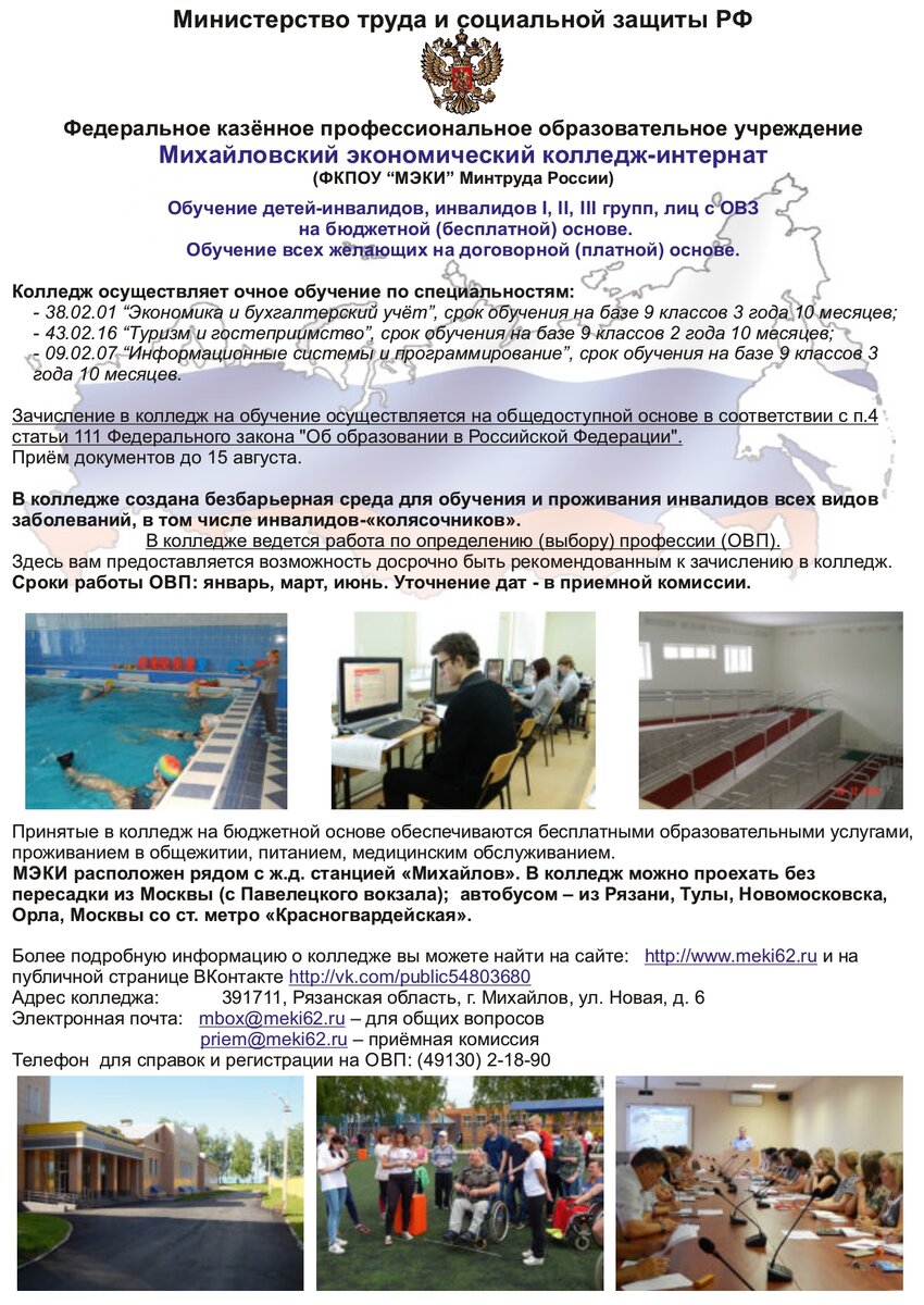 Уважаемые жители города Ярославля! ФКПОУ «Михайловский экономический колледж-интернат» приглашает инвалидов и лиц с ограниченными возможностями здоровья (ОВЗ) на бесплатное очное обучение по специальностям: - «Экономика и бухгалтерский учет», квалификация – бухгалтер, специалист по налогообложению; - «Информационные системы и программирование», квалификация – техник-программист; - «Туризм и гостеприимство», квалификация – специалист по туризму и гостеприимству. В июне Колледж приглашает принять участие в «Определение выбора профессии»: - с 18 по 20 июня; (заезд 17 июня, отъезд 20 июня). За три дня Вы сможете познакомиться с колледжем, пройти тестирования и профессиональные пробы, которые помогут определить профессию, соответствующую Вашим желаниям, способностям и наклонностям. Телефон для справок и регистрации на «Определение выбора профессии»: - (49130) 2-18-90. Вы можете также зарегистрироваться онлайн по ссылке https://vk.com/meki62?w=app5619682_-54803680%252343473. Более подроб