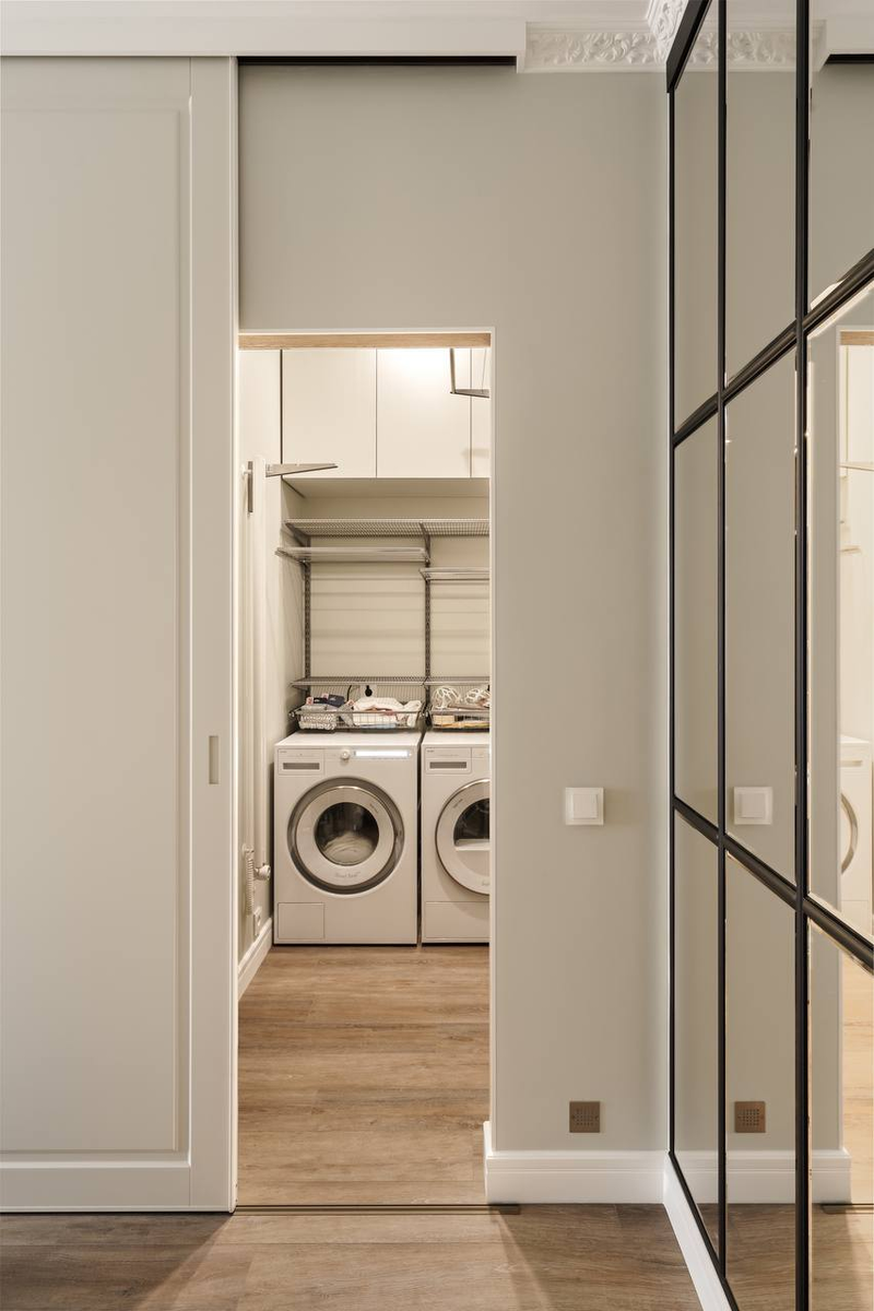 Постирочная - это удобное решение для частного дома или квартиры практически любой площади. Отдельное помещение, в котором стирают и сушат белье, обустраивают даже на 4 м2, не говоря о больших комнатах. Как это грамотно сделать и что учесть, чтобы процесс рутинных хлопот не вызывал раздражение, а стал даже эстетически приятным? Рассказываем в этой статье! Постирочная в ванной 1. Расположить всю технику и дополнительную мебель вдоль одной стены. 2. Для максимальной экономии места рекомендуется установите стиральную и сушильную машину друг на друга. 3. Установите шкаф пенал рядом со стиральной и сушильной машиной. В нем можно хранить: Если в комнате хотчется создать атмосефру минимализма, то технику, также можно полностью спрятать в шкаф, как в проекте ниже. Прачечный шкаф Это актуальный и современный вариант для мини-постирочной: стиральную машину и все принадлежности для стирки можно умело спрятать в незаметный встроенный шкаф в корриодоре. Решение особенно актуально для тех, у ко