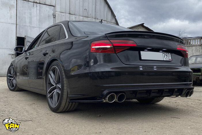 Приехала к нам #Ауди (#Audi) #S8 #D4FL на установку диффузора заднего бампера и уголков под #бампер. Машинка интересная, в ней почти 900 лошадиных сил, выхлоп построен на 76мм трубе с переключением на громкий и тихий режимы. В общем, автомобиль зачетный. Теперь эта S8 имеет вид, владелец будет ставить #сплиттеры под #пороги и под передний #бампер, чтоб #тюнинг смотрелся единым образом, а не разрозненными деталями.