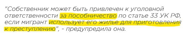 Владельцы жилья, сдающие его мигрантам, могут быть привлечены к уголовной ответственности, если арендатор использовал квартиру для преступных целей! Теоретически, правоохранительным органам нужно будет еще доказать умысел собственника, и что он знал о готовящемся правонарушении. Однако на практике таким доказательством могут стать, например, показания преступника. 🔖 ФАКТ: аренда станет дороже в столице для мигрантов, да и не все собственники готовы будут идти на такие риски! Больше полезной информации https://t.me/pro_nedvig_light