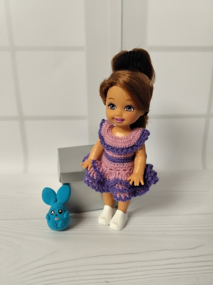 Платье для Келли. Вяжем крючком . Ниточки - акрил для вышивания. Розовая нить . Цепочка из 32 петель. 1 ряд: столбики без накида 2 ряд: 2 столбика с накидом, потом по 2 столбика с накидом в каждую петлю, и в конце тоже 2 столбика с накидом Фиолетовая нить . 3 ряд: 56 ст.б.н. Розовая нить. 4 ряд: за заднюю дольку провязываем, переднюю оставляем для оборочки, 7 ст.б.н., 3 в.п., 13 петель пропустить, 16 ст.б.н., 3 в.п., 13 петель пропустить, 7 ст.б.н. 5 ряд: ст.б.н. 6 ряд: ст.б.н. Фиолетовая нить . 7 ряд: ст.б.н. 8 ряд: ст.б.н. Розовая нить. 9 ряд: ст.б.н. 10 ряд: ( 2 ст.б.н., приб.)* 11 ряд: через две петли - 1 ст.б.н., 2 в.п. 12 ряд: в первую арочку веерочек - (1 в.п., 1 ст. с накидом )* - 5 раз, 1 в.п., во вторую арочку - 1 ст.б.н. И так чередуем до конца ряда. Соединяем с началом ряда соединительной петлей, и дальше вяжем по кругу. 13 ряд: под каждый столбик веерочка провязываем столбик с 2 накидами, чередуя с воздушной петлей, над столбиком без накида провязываем столбик с накидо