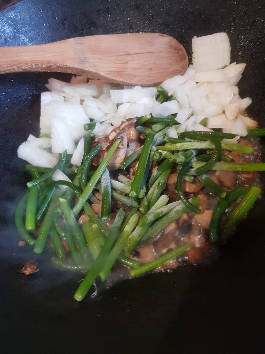 Времени на приготовление ужина не было от слова совсем. В голове прокручивала варианты и сразу они отлетали в сторону. То мясо нужно разморозить, то в магазин бежать. Нет, это не в моей ситуации, нужна была идея. Потом открыла морозилку и идея нарисовалась сама собой. В морозилке я нашла немного резанных шампиньонов, стрелки чеснока и морковь. Я решила приготовить рис с овощами. Согласитесь это же не будет просто рис, к которому нужно что-то подать. Это получится полноценный ужин, к которому можно порезать свежие овощи и все. Пока я бегала за овощами в морозилку, на плите уже грелось масло в казане. Забросила овощи в казан и пока из них испарялась жидкость я порезала луковицу. Позже добавила масло и морковь. Пока овощи готовились, я немного убрала на кухне и помыла длинный рис. Засыпала его в казан и всё, осталось немного подождать и можно ужинать. На все про все у меня ушло 20 минут. Если у вас на примете такие же варианты быстрых ужинов, буде рада послушать. Делитесь в комментари