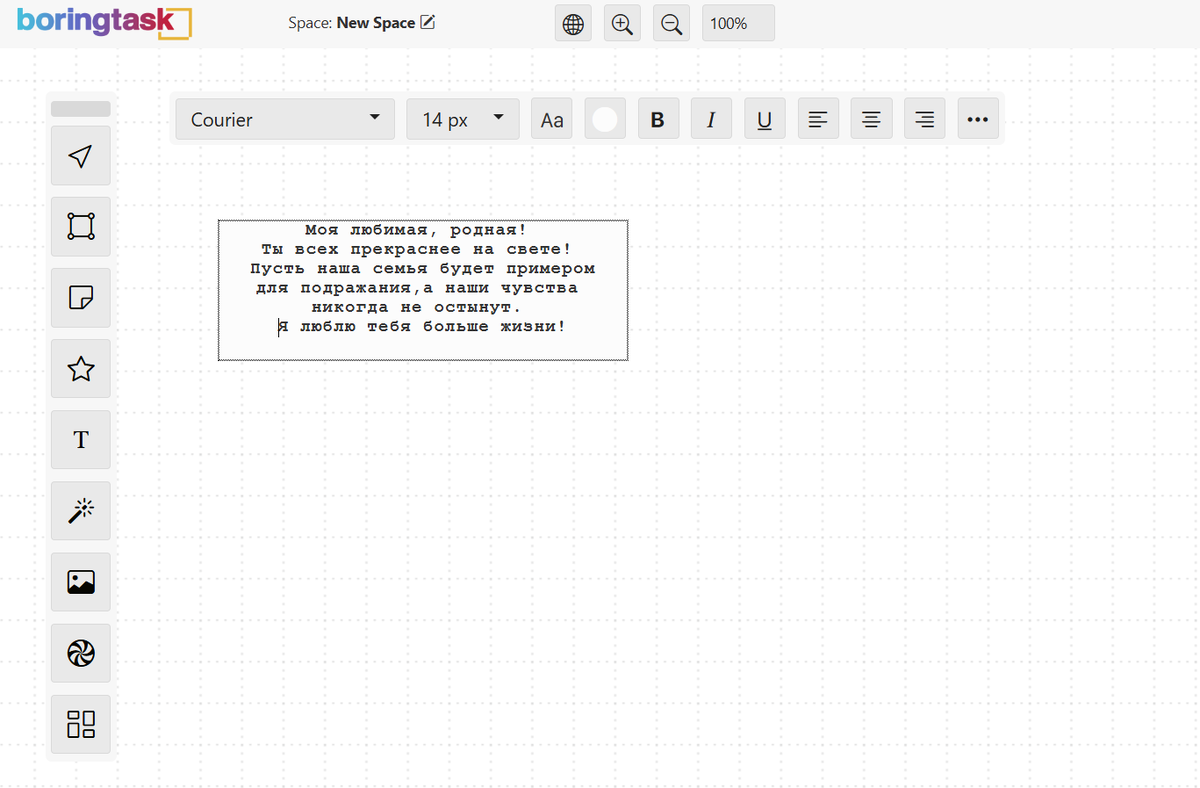 Привет, друзья! День семьи, любви и верности - это прекрасный повод для того, чтобы поздравить своих близких и родных. И сегодня мы расскажем вам, как сделать оригинальную открытку в онлайн-редакторе Boringtask с помощью нейросети всего лишь в 2 шага. Открываем Boringtask и добавляем текст поздравления или любое другое сообщение, которое вы хотите передать вашим близким. Пример: Моя любимая, родная, ты всех прекраснее на свете! Пусть наша семья будет примером для подражания, а наши чувства никогда не остынут. Я люблю тебя больше жизни! Выделяем текст с помощью инструмента выбора нескольких объектов и в появившемся сайдбаре нажимаем кнопку генерации открытки: В окне генерации пишем промт: описание, что мы хотим видеть на открытке. Так как символом праздника 8 июля считаются ромашки, мы решили сгенерировать букет: Готово! После того, как вы закончите дизайн открытки, сохраните ее и отправьте своим близким. Не забудьте добавить личное пожелание и поздравление - ведь именно они делают от