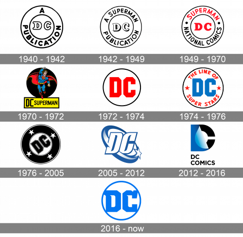 Красный цвет появился в фирменном стиле DC Comics в 1948 году, когда часть «Супермена», расположенная в верхней части кадра, и «DC» в центре были окрашены в красный цвет, а нижняя черная часть словесного знака состояла из «Национальных комиксов» в черном цвете.