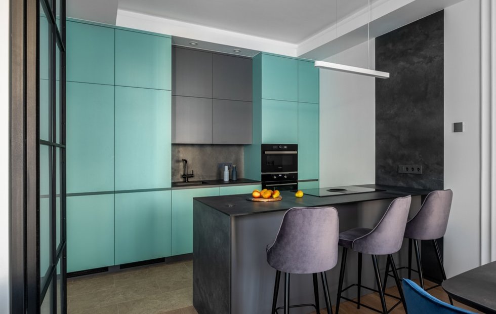 Для фасадов выбрали красивый оттенок «тиффани». На его фоне особенно контрастно и эффектно смотрятся панели под штукатурку.