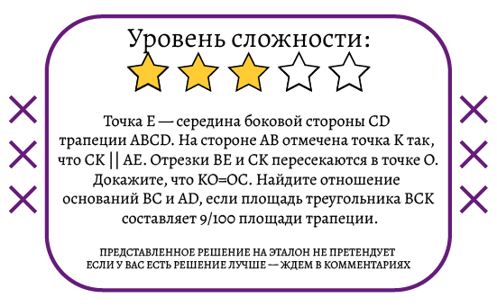 Всем привет, извиняюсь за небольшой перерыв. Сегодня такая задачка: Точка E — середина боковой стороны CD трапеции ABCD. На стороне AB отмечена точка K так, что CK || AE. Отрезки BE и CK пересекаются в точке O. Для начала изобразим всё, что дано в условии: Нам даны параллельные прямые, а значит хотелось бы найти подобные фигуры. Продлим AE, чтобы получить их: Заметим, что получилось два равных треугольника (по стороне и двум углам): А значит, и оставшиеся стороны в этих треугольниках равны: Тогда BE — это медиана. Теперь найдем подобные треугольники (угол ABF общий): Из этого следует, что и BO медиана, так как она лежит на медиане большего из подобных треугольников, что и требовалось доказать: Рассмотрим второй пункт. Во первых, заметим, что трапеция ABCD и треугольник ABF равновелики: А это дает нам отношение подобных треугольников, найдем коэффициент подобия: Теперь мы знаем, как относятся стороны в этих треугольниках: Остальное — дело техники: Используя коэффициент подобия, запишем