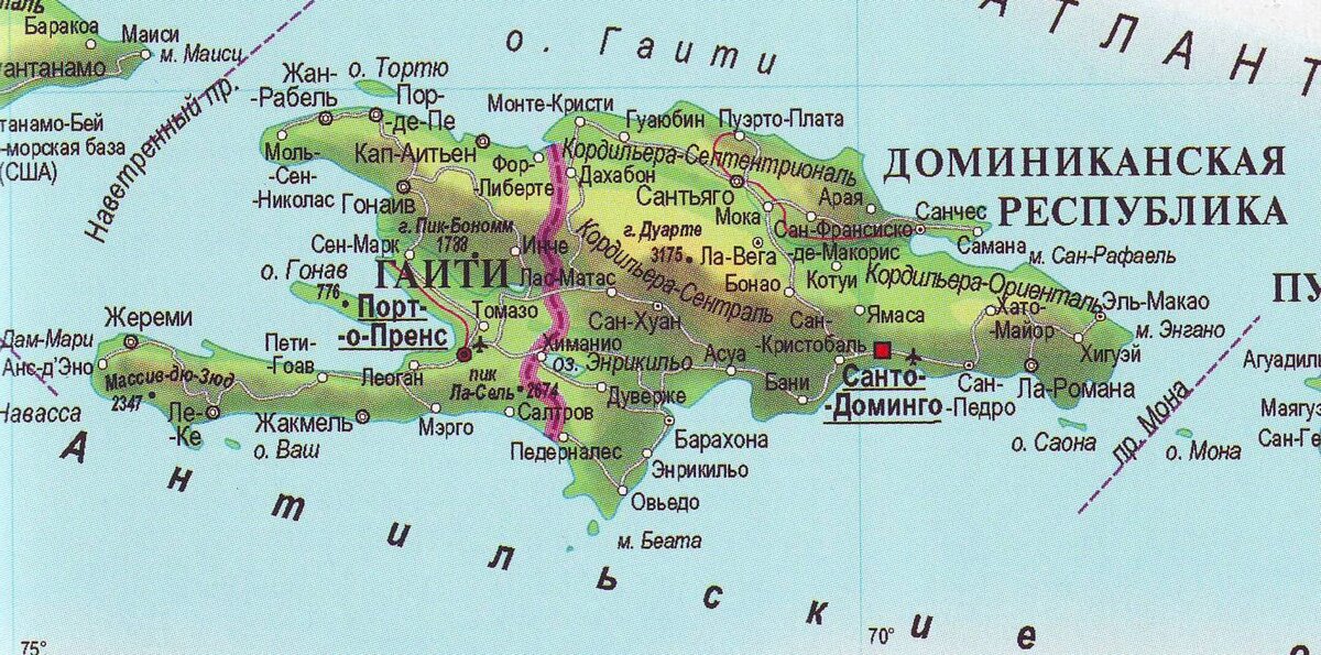 Остров Гаити с юга омывается Карибским морем, с севера - Атлантикой. Примерно треть острова занимает Республика Гаити и две трети -Доминиканская Республика, известная своими отелями и райскими курортами. Население двух государств приблизительно равно.
