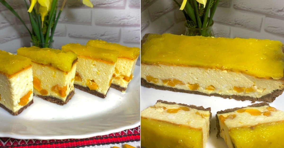 - 13 Сверху на остывший сырник выкладываем фруктовый крем. Равномерно его распределяем по всей верхушке десерта. Оставляем лакомство на кухне до полного застывания курда. Готово!
