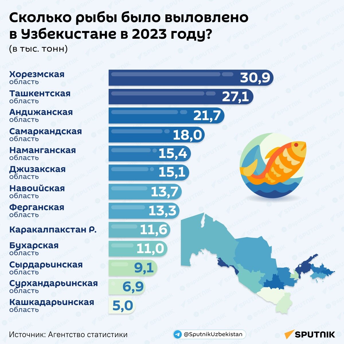 Самый большой объем улова — в Хорезмской области. Он составил 15,6% от общего количества выловленной рыбы по республике. В 2023 году в Узбекистане было выловлено 198,9 тыс. тонн рыбы, сообщает Агентство статистики. По сравнению с 2022 годом объем рыбоводства в республике увеличился в 7,3 раза. Больше всего рыбы выловили в Хорезмской области — 30,9 тыс. тонн. Доля региона в общем объеме улова составила 15,6%. В тройке лидеров также Ташкентская (27,1 тыс. тонн) и Андижанская (21,7 тыс. тонн) области. Самые низкие показатели улова зафиксировали в Кашкадарьинской области (5 тыс. тонн). Подробности — в нашей инфографике.