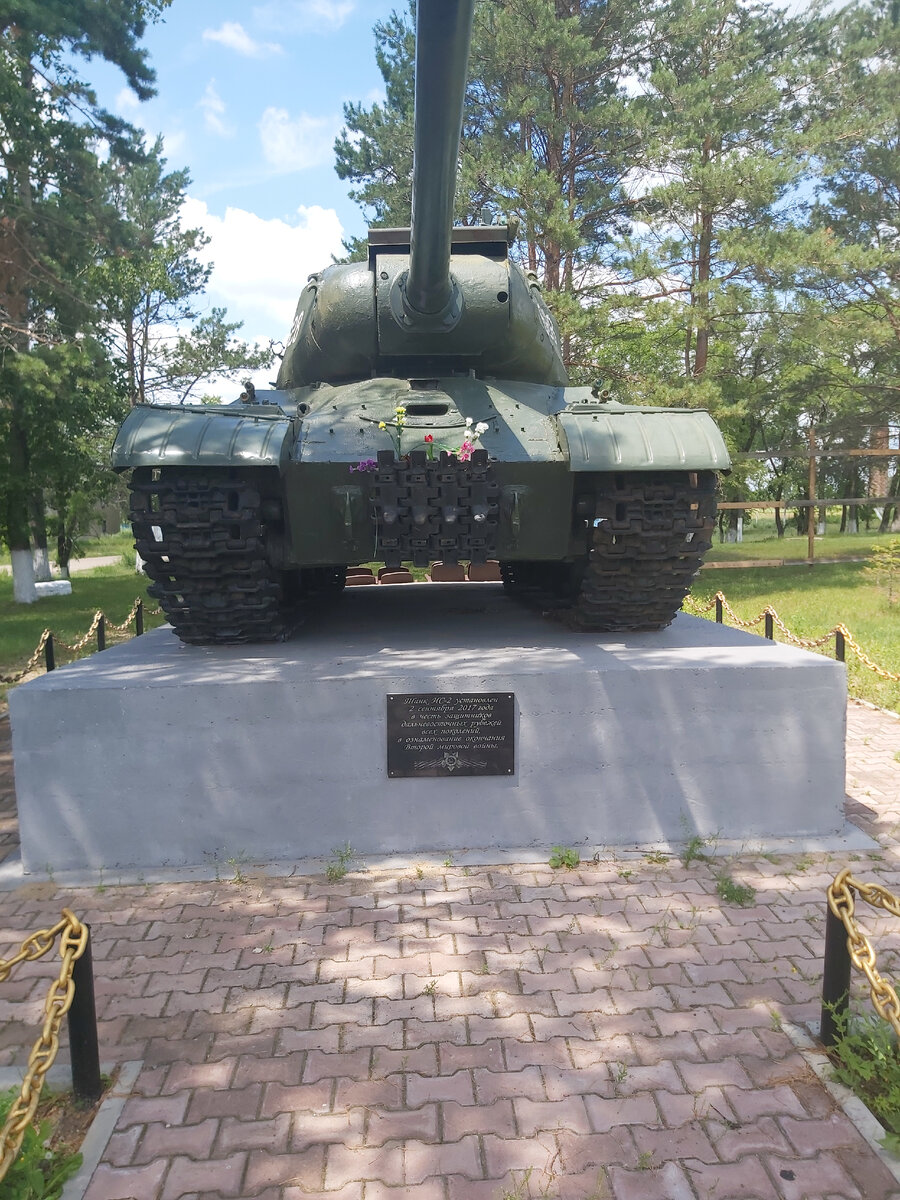 При выезде из села, на бугорке в сквере, сельчане установили символ Великой Победы - танк "ИС-2".