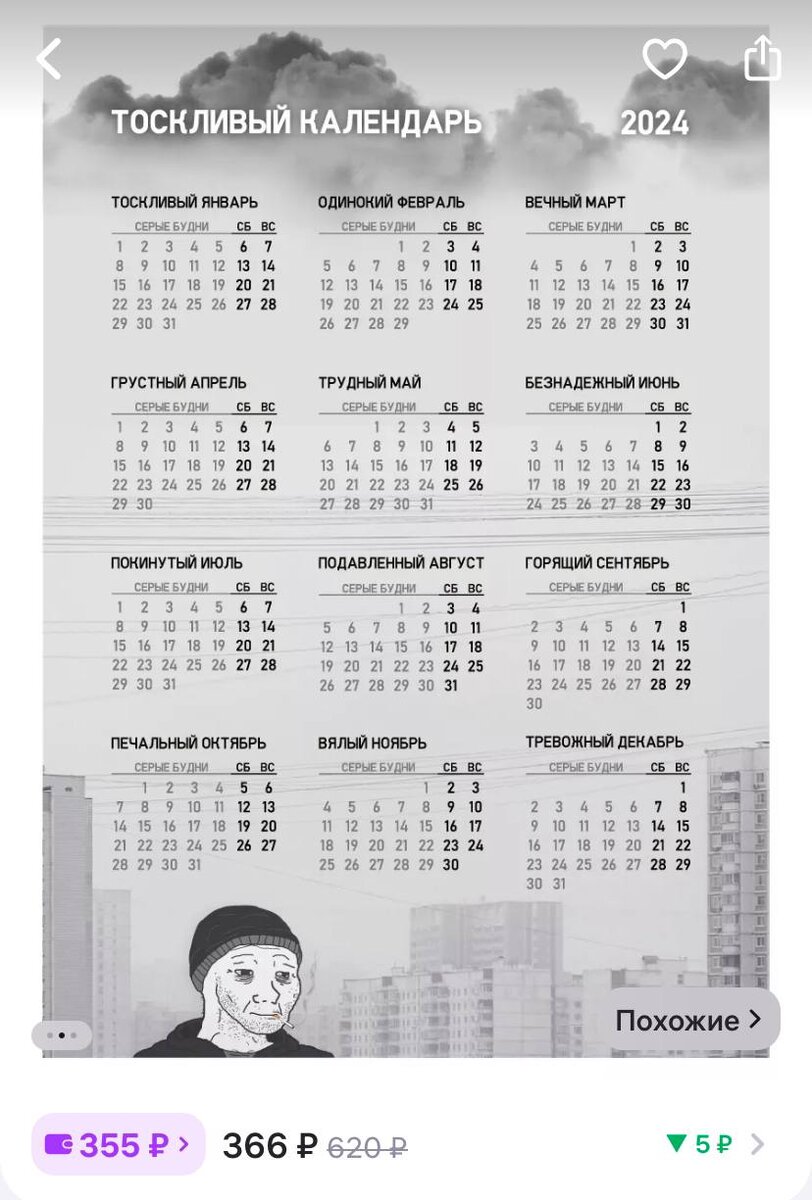 Нашли «Тоскливый Календарь» для самых депрессивных. Как видно, ни одного хорошего месяца в 2024 не ожидается.Буквально расписали наше состояние на весь год.