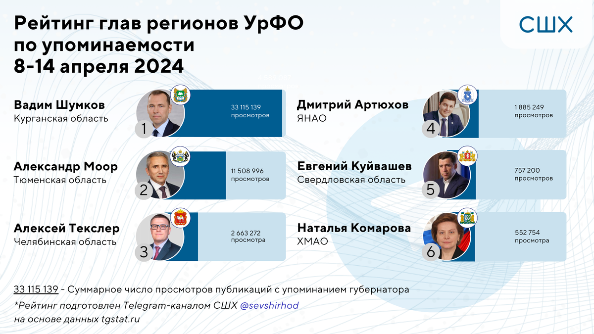 Феноменальный успех демонстрирует губернатор Курганской области Вадим Шумков с 33 115 139 просмотрами (нет, мы не ошиблись) и 3 140 упоминаниями. На втором месте — губернатор Тюменской области Александр Моор с 11 508 996 и 1 076 упоминаниями. Третье место у губернатора Челябинской области Алексея Текслера с 2 663 272 просмотрами и 1 228 публикациями. Причина всеобщего внимания — сложнейший паводок, пришедший на Урал.