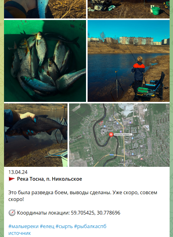 Места последних поимок и новости о рыбалке в Ленинградской области и СПб за прошедшие дни второй недели апреля 2024. Ниже подборка лучших отчетов о рыбалке. 1) В реку Тосна постепенно начинает заходить сырть, полноценного хода ещё нет. Все только начинается. Но рыбаков уже очень много, места быстро занимают, скоро будет проблемно встать там. 2) На Водосливном канале в Сестрорецке пошёл окунь. Теперь есть буквально неделя - две максимум, чтобы относительно спокойно половить на спиннинг. Затем туда зайдет корюшка и начнётся дикий ужас, когда приедут тысячи людей с пауками, чтобы черпать корюшку. 3) На Волхове в нижнем течении можно уже неплохо половить сопу, густеру и остальную бель. Леща пока попадается не много, но тоже идёт. Воды по прежнему высокий уровень и течение сильное, периодически несет пену и мусор. 4) Клёв корюшки на дамбе стабилизировался. На неделе было пару плохих дней, но затем она снова проклюнулсь. Однако активность плохая все равно, многие вовсе поймали не более дес