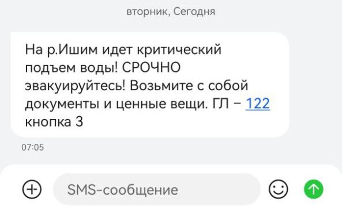 «На р. Ишим идет критический подъем воды! СРОЧНО эвакуируйтесь! Возьмите с собой документы и ценные вещи. ГЛ — 122 кнопка 3».