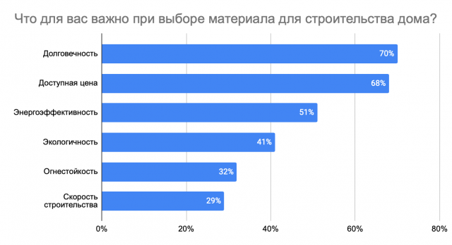 Участникам исследования предложили указать три главных критерия, которыми они руководствуются при выборе стенового материала. Самой востребованной оказалась долговечность, на которую указали 70 % опрошенных. Для 68 % респондентов почти так же важна доступная цена, третье место заняла энергоэффективность: её принимает в расчёт 51 % будущих домовладельцев.