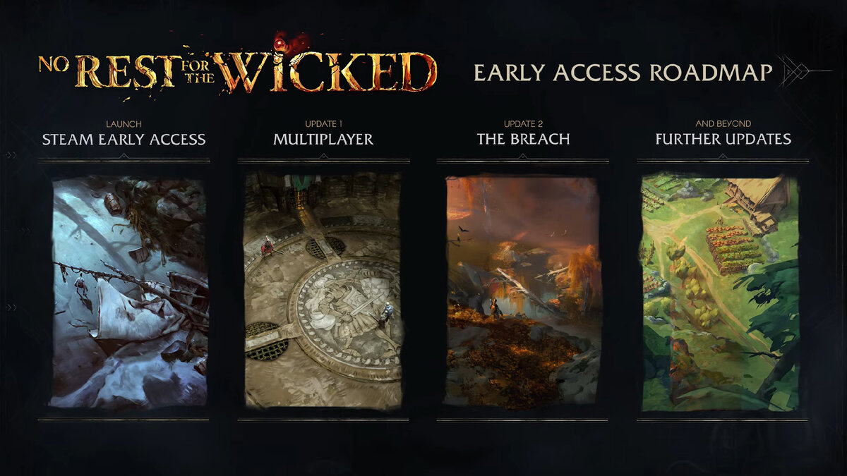 Разрабочики Moon Studios, создатели Ori, представили новый трейлер игры No Rest for the Wicked, ознаменовав скорый ранний доступ уже 18 апреля. В трейлере, в принципе, ничего нового не показали, за исключением пары новых игровых кадров. В раннем доступе будут доступны - первая глава кампании, подземелье Cerim Crucible, ежедневные и еженедельные задания, а также несколько боссов. Опубликовали так же подобие дорожной карты: Первое обновление раннего доступа добавит в игру мультиплеер, далее кооператив до 4 игроков с PvP ареной, и "Разлом", который будет подобием генерируемых подземелий.