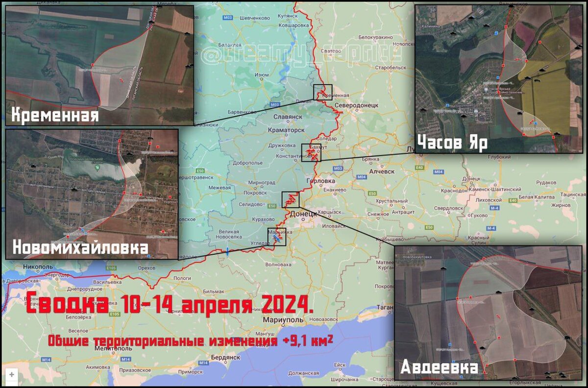 О сказках Венского леса я расскажу сегодня позже, а пока о фактах. По данным объективного контроля, с 10 по 14 апреля ВСР освободили чуть менее 10 кв.км. на 4 направлениях – Кременная, Новомихайловка, Часов Яр, Авдеевка. За последние двое суток освобождено как бы не больше. Прежде всего это Авдеевский участок фронта. Здесь нашим удалось полностью занять СНТ Заря, выйдя с В на Керамик, а с Ю на Новобахмутовку. До Очеретино около километра. Пр-к наше продвижение подтверждает. Как результат, сегодня добивают последних вояк Хунты на СЗ окраине Бердычей. В расположенной встык южнее Семёновке идёт зачистка, по данным на вечер в поселке организованной обороны ВСХ больше нет. Полное освобождение этих двух сел дает ВСР возможность двигаться на юг уже по западному берегу Дурной реки, нанося фланговый удар по окопавшимся в Уманском ВХ. По уму, пр-ку следует создавать линию фронта с опорой на Очеретино- Соловьево-Новопокровское-Новоселовка 1-я и далее вдоль Вольчьей речки до Карловского в/х. Вот т