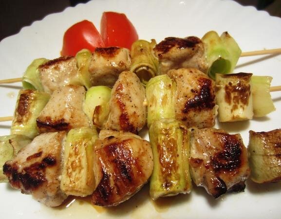 - Нанизываем на шпажки кусочки мяса и кабачка.