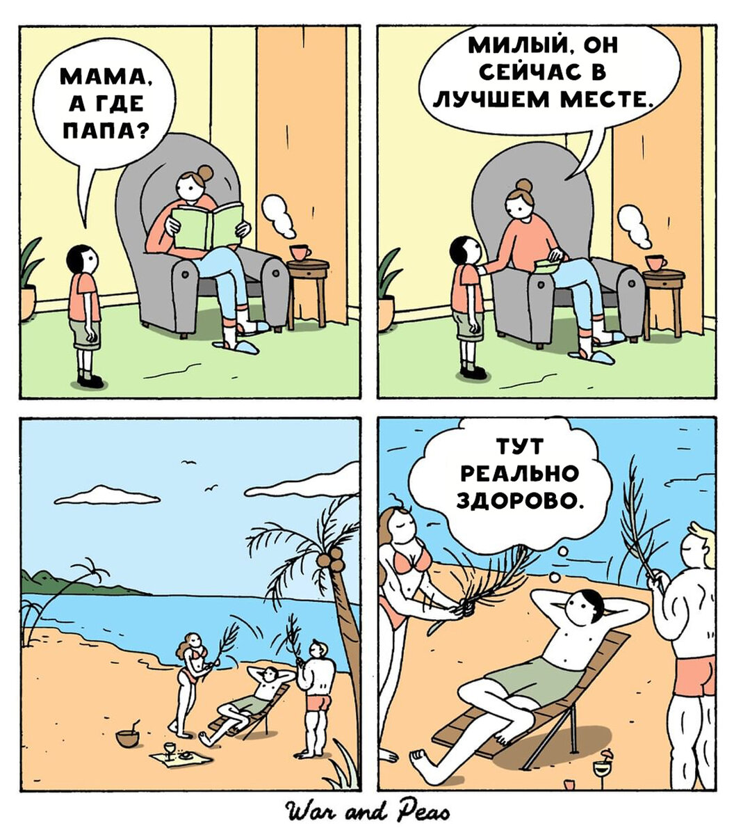 Для этих молодых ребят из Саарбрюккена как будто не существует запретных тем. Они шутят об отношениях, офисной культуре, мистике, религии, детях, животных – и так далее, и тому подобное. Хохмить на грани фола – тонкое искусство и творческий тандем War & Peas прекрасно справляется с этой задачей. Если вы не чураетесь черного юмора, не стесняемся, заходим и читаем, будет шутка и на ваш вкус. Кстати, считается, что черный юмор – не для всех. Однако статистика – упрямая штука и по просмотрам публикаций в своем блоге я вижу, что хулиганские комиксы часто вызывают повышенный интерес. Видимо, всё-таки хочется многим хотя бы одним глазком оценить, что там провокационного нарисовал художник. Но тут ведь нет единой метрики. Для одних обидной может показаться даже практически нейтральная шутка, другие же, образно выражаясь, не боятся жгучего мексиканского перца. Элизабет Пич и Джонатан Кунц живут и работают в Германии. Многие уверены, что у мужчин и женщин слишком разное чувство юмора. Возможно,