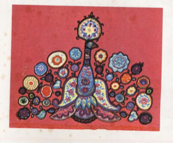 Панно "Жар-птица" . Бесплатное приложение к журналу "Работница" № 3 за 1976 год. Не так известно, как "Разговор". Посмотрите, как схема тщательно начертана, каждый шов и стежок можно увидеть (и даже раскрасить)! Панно выполнено посредством вышивки и аппликации на льне, рогожке или иной плотной ткани. Для аппликаций подбирают яркие цветные лоскуты ситца, сатина, шелка, желательно с цветочным орнаментом. Вышивка выполнена цвет- ными и черными нитками мулине (вЗи 6 ниток) простейшими швами — обметочным и петельным, как указано на рисунке. Рисунок дан в натуральную величину. Можно его, конечно, увеличить — разграфить лист на клетки и перенести на такие же клетки большего масштаба. Сначала на листе с рисунком поищите лучшее место для того или иного кусочка ткани — передвигайте их, переставляйте, добиваясь наиболее удачного цветового решения. Закончив раскладывать этот лоскутный пасьянс, укрепите все лоскутки на нужных местах булавками. Переводя рисунок на ткань, начинайте нашивать лоскутк