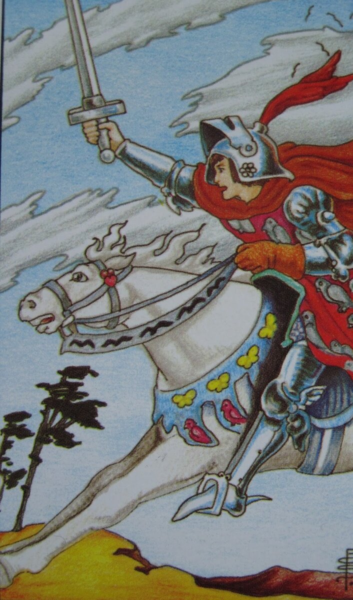 Рыцарь Мечей – карта, несущая весьма поспешную и агрессивную энергетику, даже в прямом положении. Это психотип человека скандального, склочного, с трудным характером, ершистого, острого на язык, любящего поиздеваться над более, с его точки зрения, слабыми. Рыцарь Мечей может часто в своем арсенале использовать сарказм, издевки и ерничество, а затем может ловко развернуть ситуацию, сказав: «Ты что обижаешься? Это же была просто шутка!» Он олицетворяет человека вероломного и ложного друга. Хитрая и смелая личность, активно действующая в своих интересах. Рыцарь Мечей обладает всеми свойствами лидера и способен убедить других последовать за ним, что делает его еще более опасным для тех, кого он избрал своими врагами. Лучше оказать ему сопротивление, чем следовать за ним. Его последователи так же получают не больше выгоды, чем его враги. Поддержу репутацию Рыцаря Мечей, как изнуряющего нервотрепателя. Выражение "Спор, ради спора" очень подходит этому персонажу. Собеседника ему трудно слушат