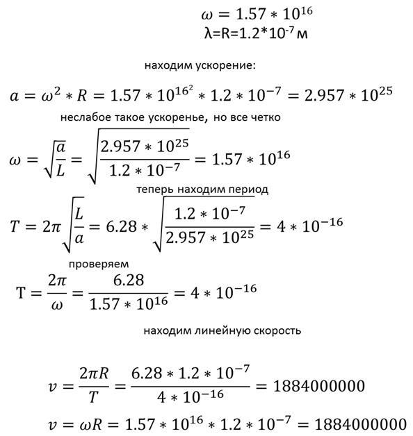 Мы, когда говорим, что циклической частоты в природе нет, нам сразу начинают доказывать, что это и циклическая частота света, и каких-то электромагнитных явлений, и движения спутников. По спутникам потом отдельно выскажемся, сейчас только скажем, что в оборотах/в секунду они реально движутся, а в радианах в секунду посчитать можно, но это особо ни о чем не говорит. Так вот, давайте про свет. За основу возьмем расчеты по маятнику. Ну, представили себе такой микроскопический маятник с длинной нитки 1.2*10^7 метра? Который никуда со скоростью 300000км никуда не летит, поскольку он маятник, маятнику положено колебаться около неподвижного центра. Циклическую частоту у него найти очень просто, достаточно обычную частоту умножить на 2π. Вот пусть у нас обычная частота 2.5*10^15 Гц превратилась в 1.57*10^16рад/с. Смотрим остальные параметры: Ну, это еще не все. Есть такая вещь, связанная с циклической частотой – волновое число. Другими словами, как-то не очень. И скорость подкачала, и длина во